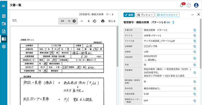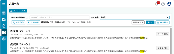 - 台帳化した項目(点検日、点検者など)での検索はもちろん、AI-OCRで読み取った書類本文のあらゆる文言(「特記事項」内の単語など)で簡単にファイルを探すことができます。