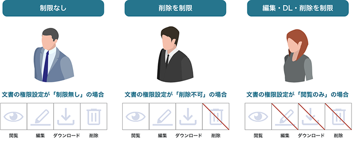 - 「A部署は閲覧のみ」「B拠点の管理職は編集可能」といったように、グループやユーザー単位で閲覧・編集・削除などの権限を柔軟に設定できます。これにより、全社で統一されたセキュアな管理体制を構築します。