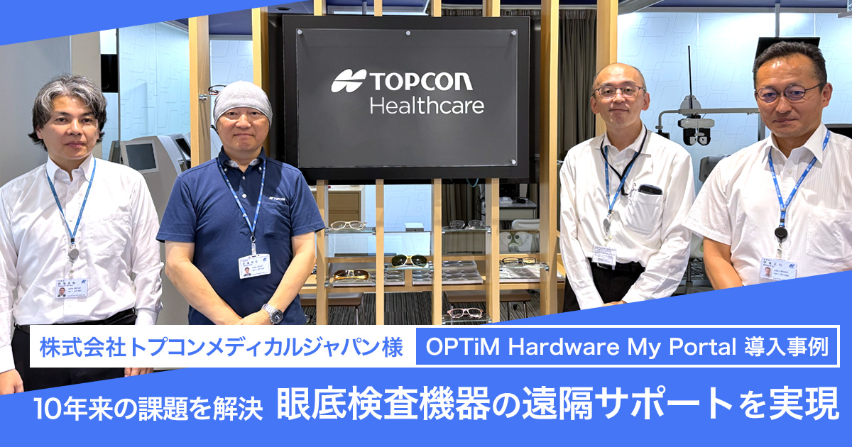 OPTiM Hardware My Portal」の導入により、医療業界特有のセキュリティ要件をクリアした遠隔サポート体制を実現しました。導入後は想定コールの5割遠隔化を見込んでいたところ、実際にはコールの8割の遠隔対応を達成し、サービス品質の向上と運用管理の効率化を実現しました。 今回は、株式会社トプコンメディカルジャパンの皆様に導入前の課題や製品選定のポイント、現在の活用状況、そして今後の展望について詳しくお話を伺いました。