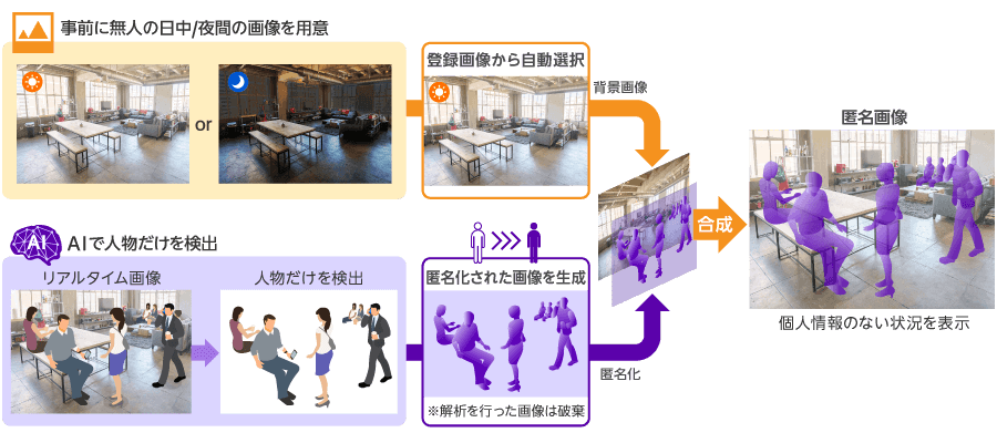 まず、事前に人物のいない背景画像(日中・夜間)を登録。 AIがリアルタイム映像から人物のみを検出し、シルエット化(匿名化)します。 解析後の映像は即時に破棄され、背景画像と匿名化データを合成して個人情報を含まない可視化画像を生成。これにより、セキュリティと利便性を両立しながら、施設運営者が安心して人流解析を導入できます。