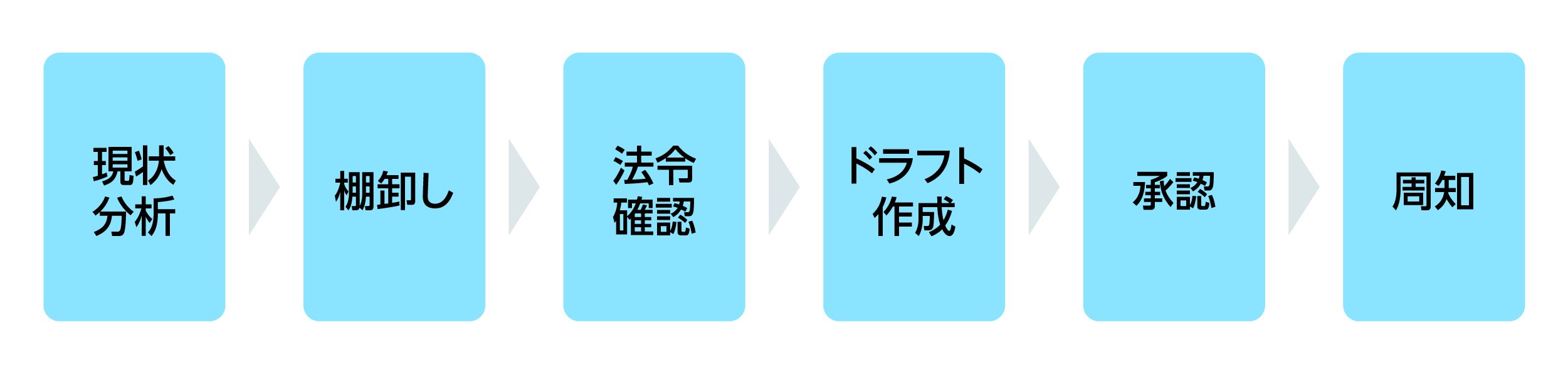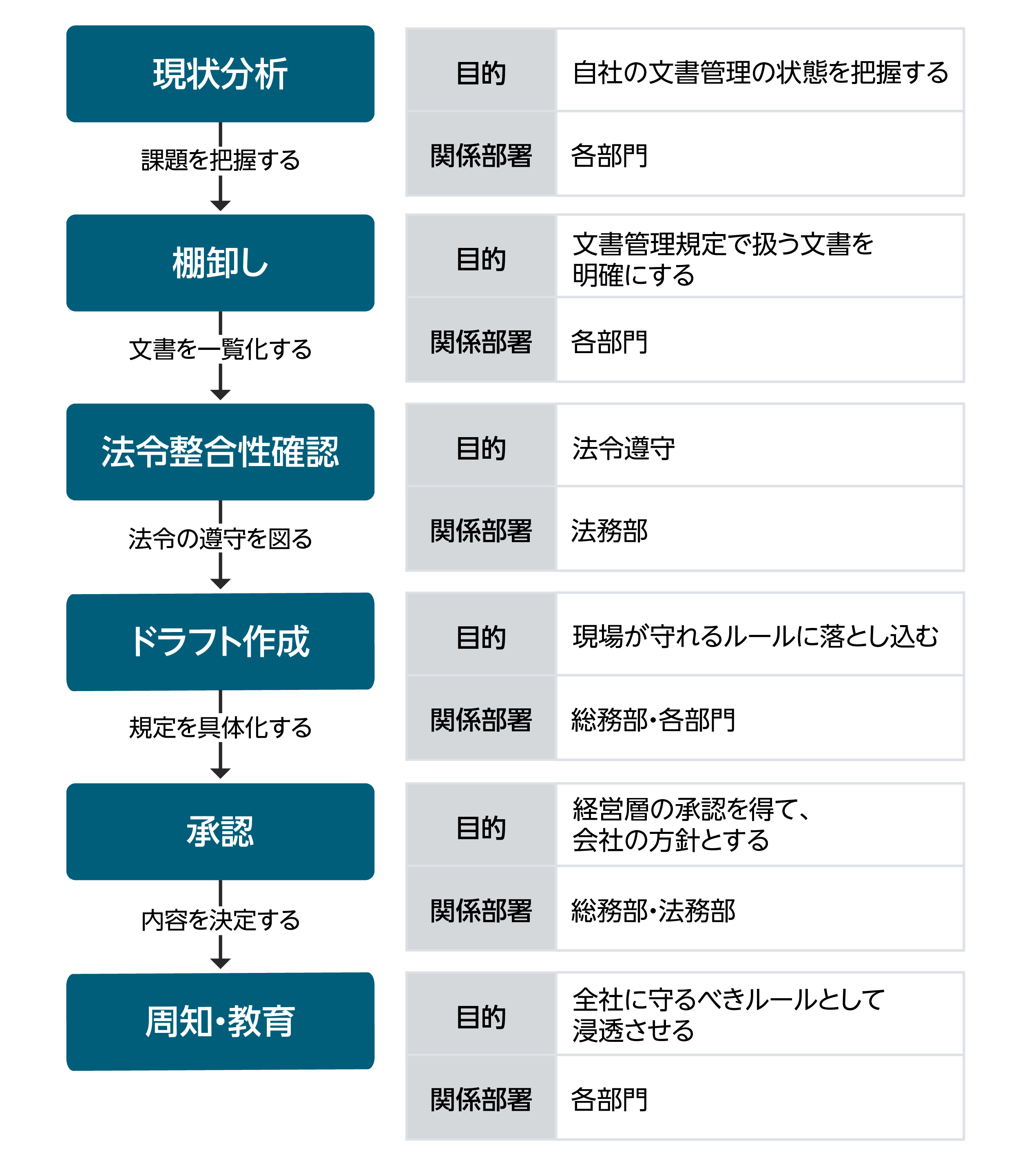 「現状分析 → 文書の棚卸し → 法令整合性の確認 → ドラフト作成とレビュー → 承認 → 社内周知・教育」という流れに沿って進めれば、誰でも導入できます。