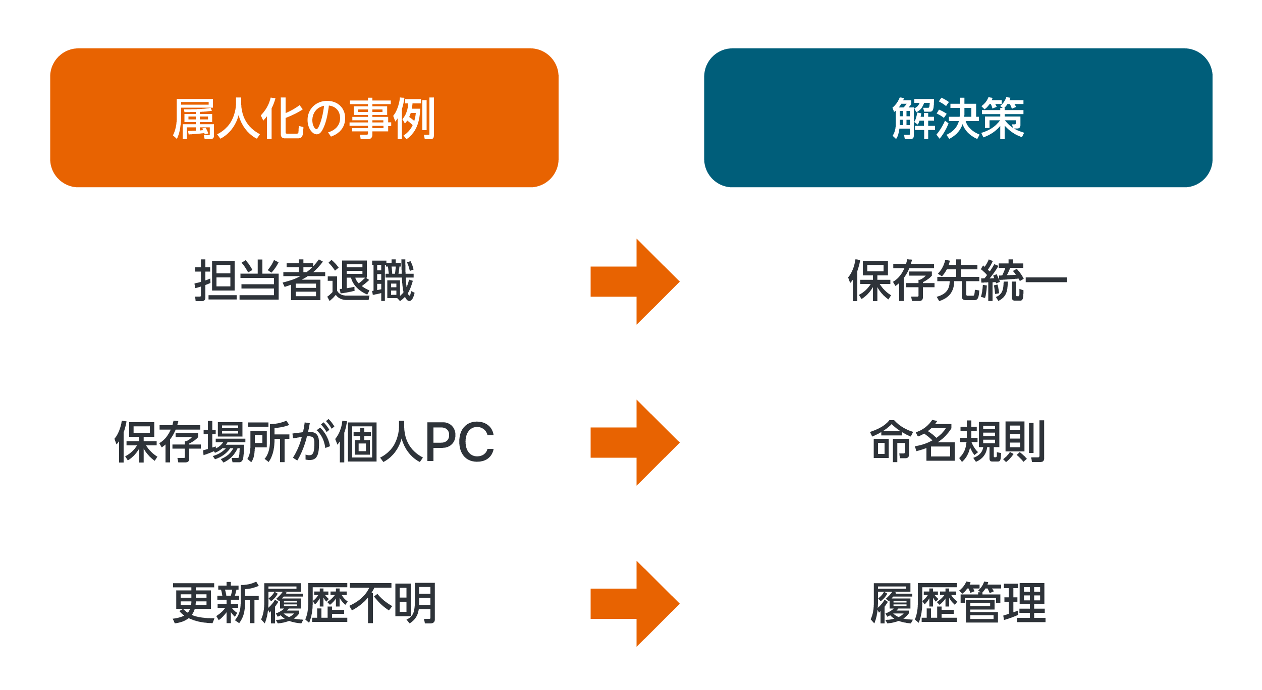 - 属人化:担当者しか文書の場所や更新状況を把握していないため、退職や異動で情報が失われる。