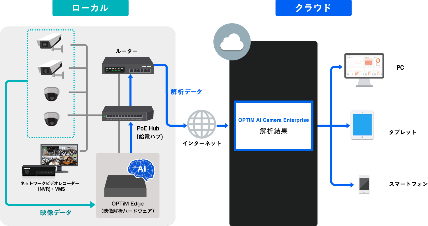 ※OPTiM AI Camera Enterprise SaaSモデルでは、映像データはローカル環境での解析時に破棄され、インターネットには上がらず安全に運⽤可能です。