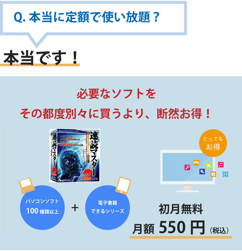 ソフト使い放題は100以上のソフトウェアと電子書籍できるシリーズ全部まとめて定額使い放題!! PC版イメージ ソフト使い放題は100以上のソフトウェアと電子書籍できるシリーズ全部まとめて定額使い放題!! SP版イメージ